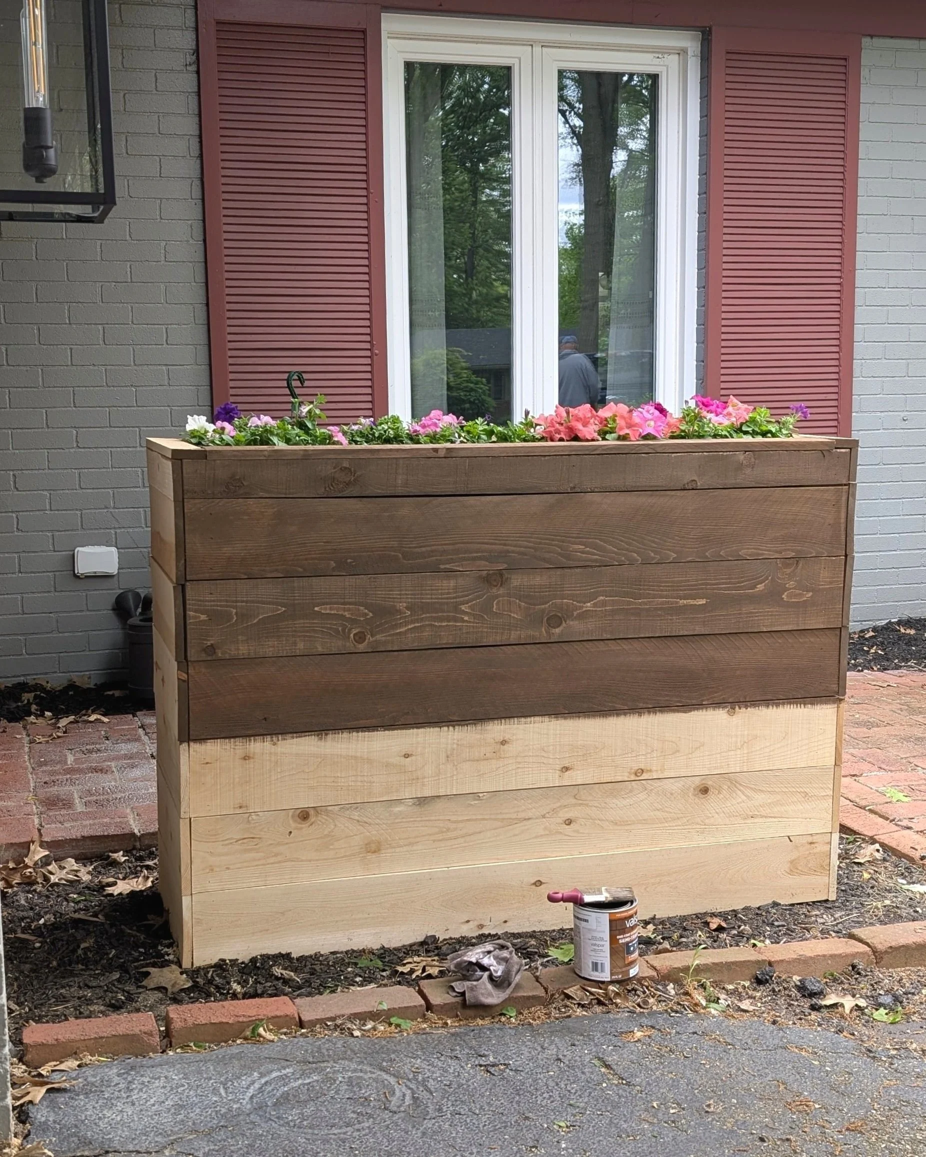 To protect my planter from the elements and tone down the color, I used this semi-transparent stain by Valspar in Chocolate Chip. It was a little more opaque than I wanted, so I brushed it on in small sections and immediately wiped it off with a rag. This gave me exactly the look I was going for (which was lucky since I didn’t sample any other options!)