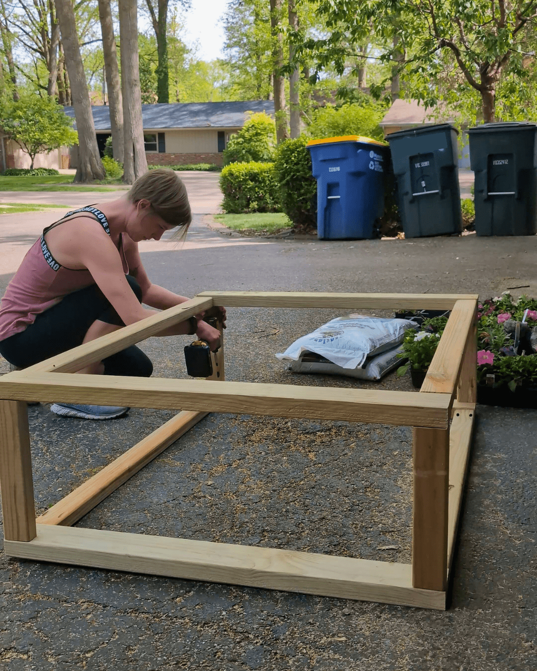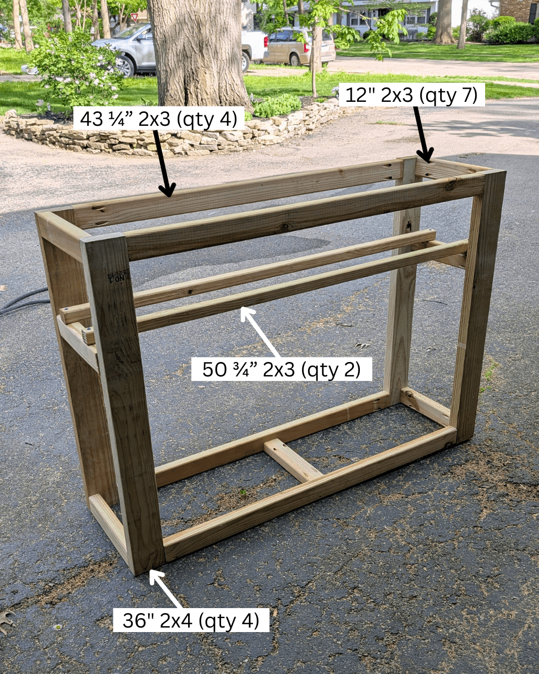 Then screw in the 50 3/4” side supports across the width. I originally used 2x2s, but they cracked—so I recommend sticking with 2x3s here for more strength.